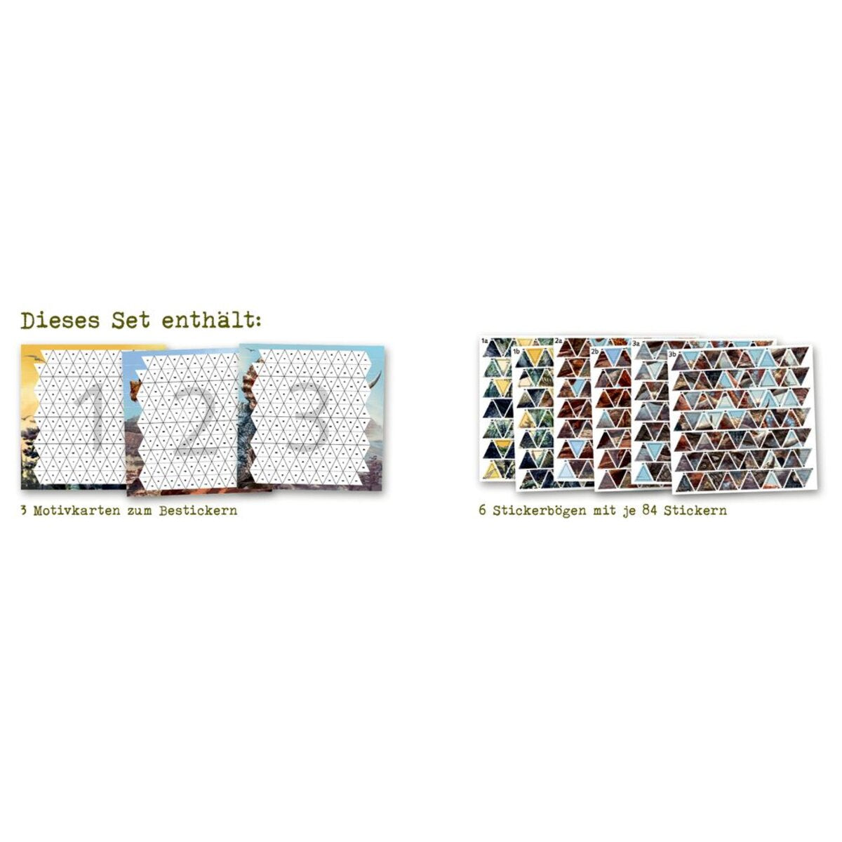 Ausstattung: Pappumschlag (23 x 23 cm, 4-fbg.) mit 3 Motivkarten (21 x 21 cm, 4-fbg.) und 6 Stickerbögen (21 x 21 cm, 4-fbg.)