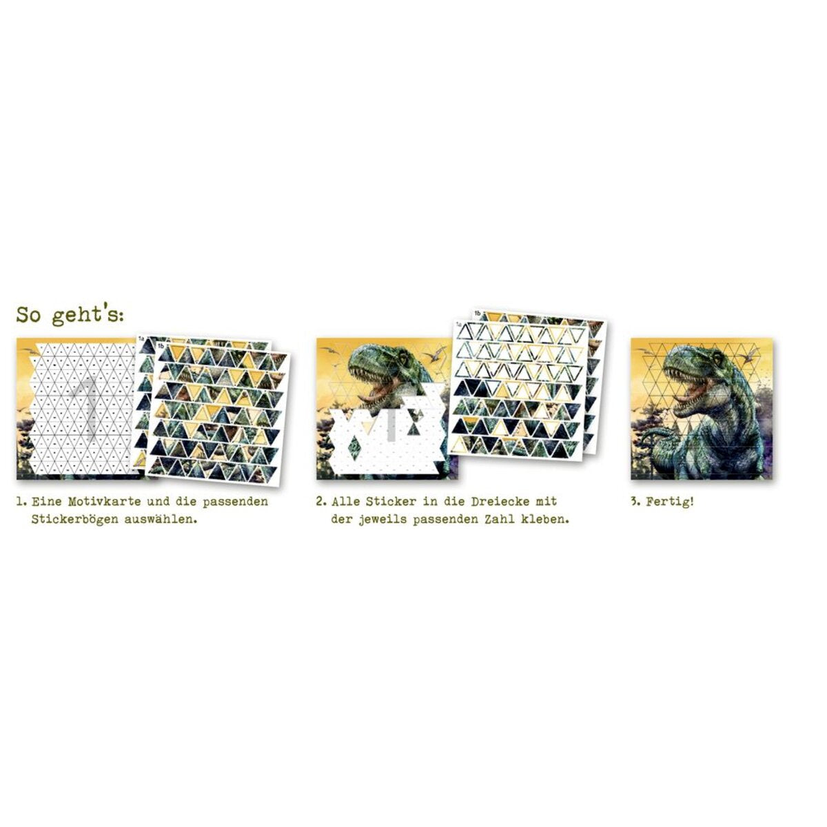 Dieses dinostarke Kreativ-Set beinhaltet 3 Dinosaurier-Motive und 6 Stickerbögen mit über 500 Aufklebern zum Vervollständigen der aufregenden Bilder nach dem Stickern-nach-Zahlen-Prinzip. So geht's: 1. Eine Motivkarte und die passenden Stickerbögen auswählen. 2. Alle Sticker in die Dreiecke mit der jeweils passenden Zahl kleben. 3. Fertig!