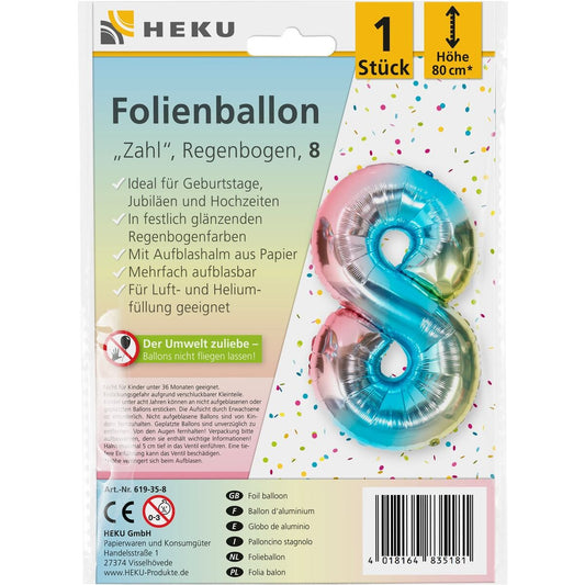 Folienballon Regenbogen Zahl 8 80cm mit Aufblashalm
