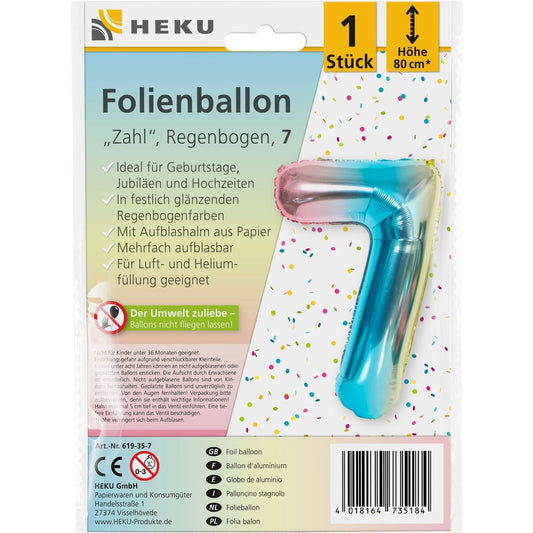 Folienballon Regenbogen Zahl 7 80cm mit Aufblashalm