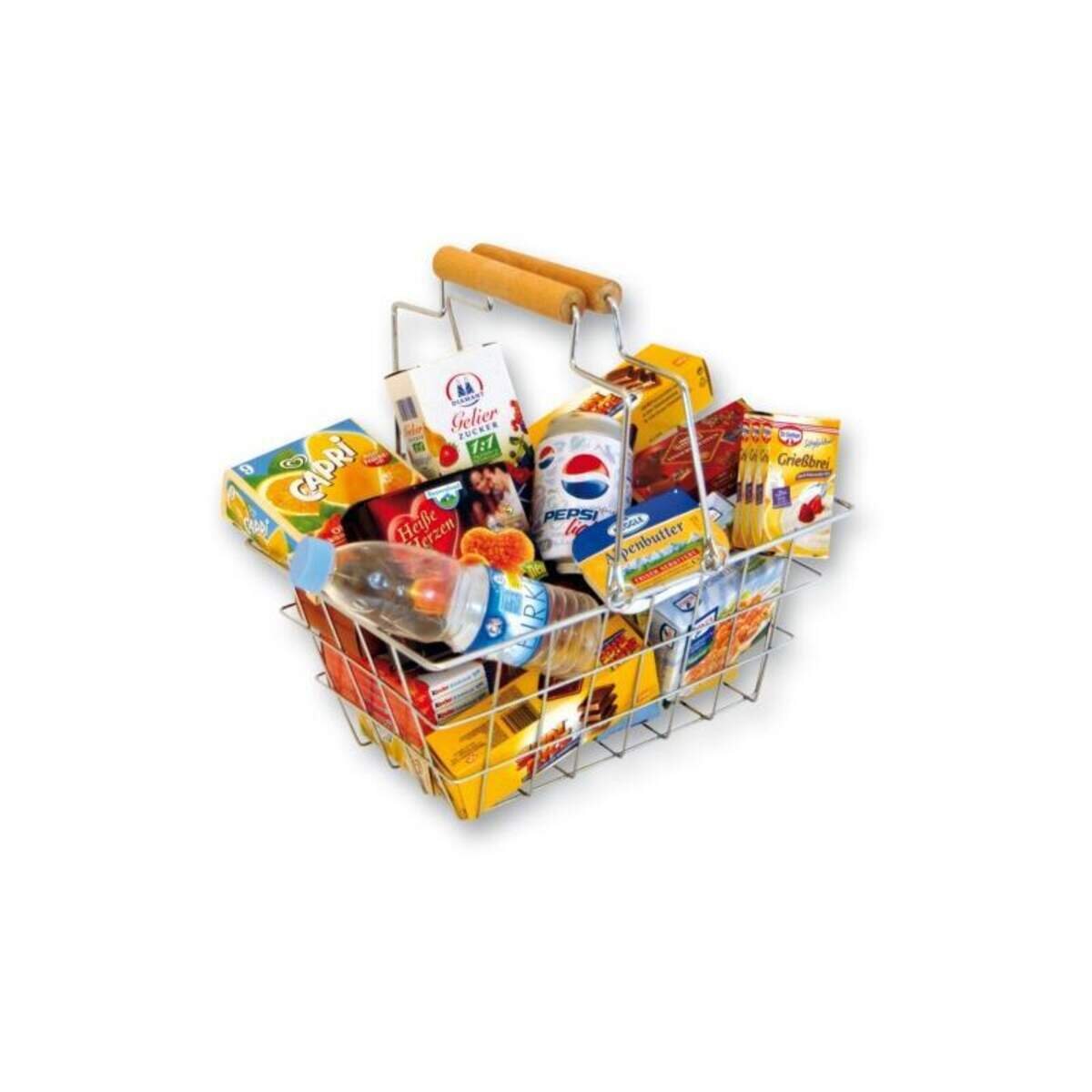 Dieser Metalltragekorb ist ideal für die Grundausstattung eines Kaufmannsladen. Der Metalltragekorb ist toll für die kleinen Verkäufer und Käufer, denn es lässt sich viel darin transportieren. Die kleinen, hochwertigen Faltschachteln, die verschiedene Supermarktprodukte definieren sind prima für das erste Verkaufen und pädagogisch wertvoll.
