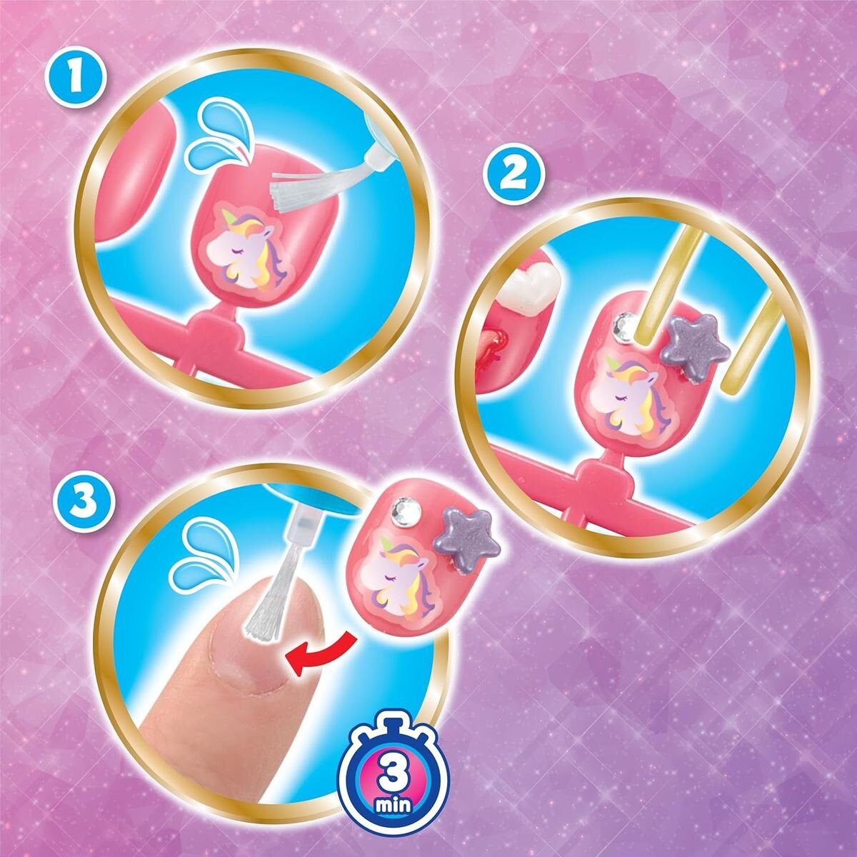 Die Dekoteile werden aus der Schablone gelöst und auf den Basteltisch in Schleifenform gelegt. Dann steckt man die Schablone mit den Nägeln unter das Herz des Basteltischs. Mit den Stickern und den Dekoteilen werden die Nägel nun dekoriert und verziert. Die Dekoration haftet, indem man die Nägel mit Wasser bestreicht und die Teile anschließend darauf drückt. Sind die Fingernägel fertig geschmückt, werden sie von der Schablone gelöst. Die eigenen Fingernägel werden nun mit Wasser bestrichen und die dekorierten Fingernägel darauf befestigt. Die Nägel haften nur durch das Wasser, man benötigt keinen Klebstoff. Nach ca. 5 min Wartezeit haften die bunten Nägel. Will man die Nägel entfernen, genügt nur ein leichtes hin und her Drücken und Schieben. Die Aquabeads Nägel sind mehrfach wiederverwendbar. Die Inhaltsstoffe der Aquabeads Nägel sind wasserlöslich und können sich beim Kontakt mit Wasser von den Fingern lösen. Im Aquabeads Nagelstudio sind der Basteltisch, eine Pinzette, Fingernägel in acht Farben, ein Wasserfläschchen mit Pinsel zum Auftragen des Wassers auf die Nägel und zahlreiche Dekorationen und Sticker enthalten.